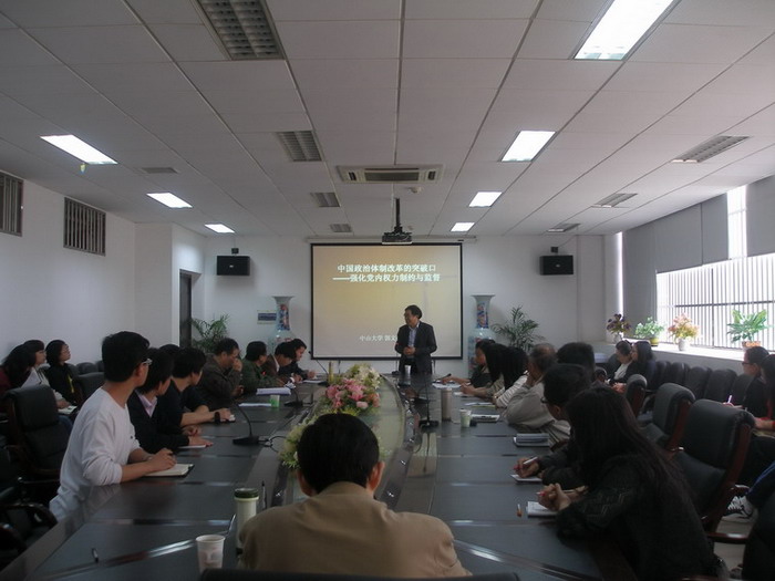 郭文亮教授论述了我国当前反腐倡廉工作的重要性和紧迫性,并旗帜鲜明地驳斥了时下的某些社会思潮,提出我国政治体制改革既不能照搬照抄西方的三权分立制度,也不能再回到“计划经济时代”去,而必须以强化党内权力制约与监督作为突破口。郭教授深入剖析了党内权力制约监督理论与机制的形成与演变,就改革党内权力制约监督机制,推进党的民主集中制建设等方面的问题阐述了自己的观点和看法。郭文亮教授渊博的党史功底、严谨的治学态度、坦诚亲近的学者风范,深深地折服了在场的广大师生。