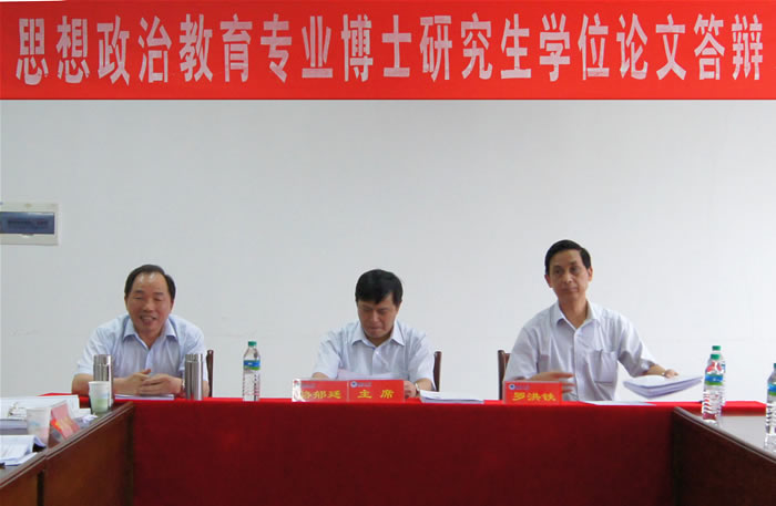 答辩委员会主席由武汉大学党委副书记、博士生导师骆郁廷教授担任,西南大学博士生导师罗洪铁教授、省教育厅副厅长、我校博士生导师程样国教授、胡伯项教授、胡松教授、陈世润教授、詹世友教授、陈勃教授7位专家担任答辩委员。